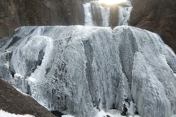 高さ120メートル、幅73メートルの巨大な滝が凍りつく。まるで時間が止まったかのような神秘的な光景に、思わず息をのむことでしょう。