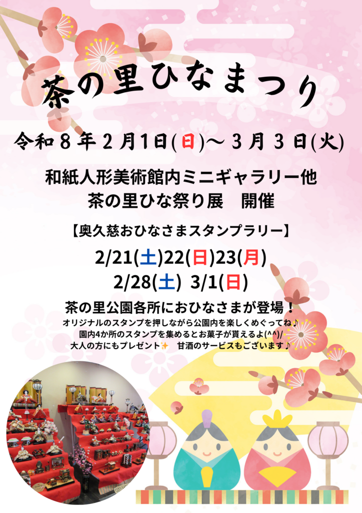 奥久慈茶の里公園では、たくさんの雛人形がずらりと並ぶ華やかなひな人形展を開催しています。